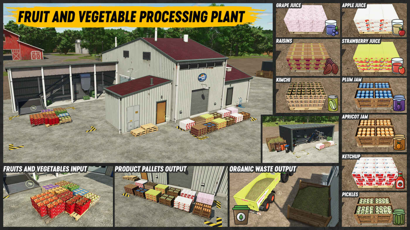 – Tous les produits de ce pack sont inclus dans les catégories PRODUCT et SELLINGSTATION_PRODUCTSFOOD fillTypes, donc toute station de vente sur n’importe quelle carte acceptant ces catégories acceptera également les produits de ce pack.