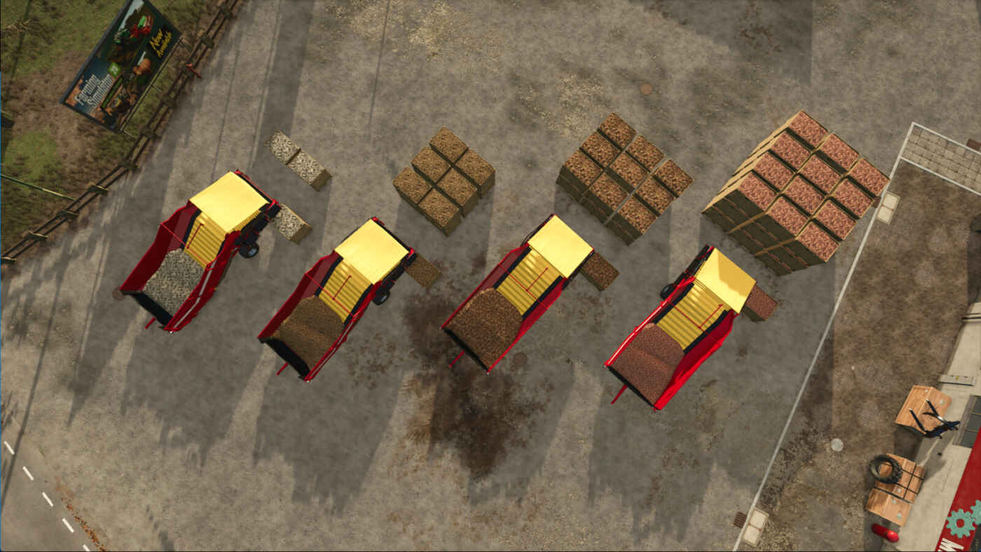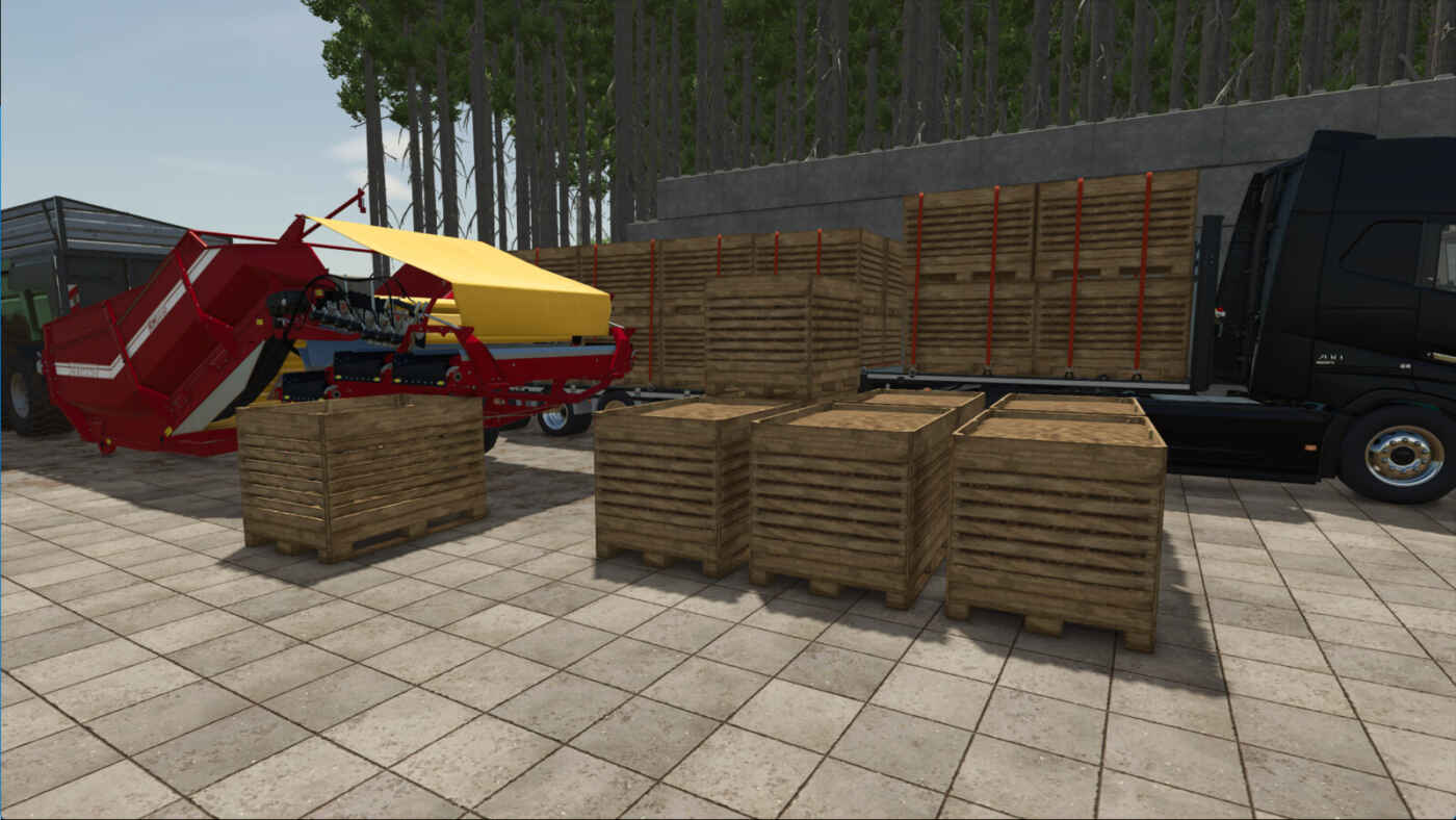 Chaque boîte est basée sur la palette de légumes Dewulf du jeu de base et peut contenir jusqu’à 2 000 litres. La boîte dispose également d’un fillTrigger qui peut donc être utilisée pour remplir des outils. Le palettiseur est entièrement compatible avec les déclencheurs de stockage en hangar et vérifie l’occupation par emplacement avant de placer une nouvelle boîte. Cela permet un fonctionnement continu avec des mods tels que Universal Autoload, qui peuvent vider la grille de palettes de manière dynamique.