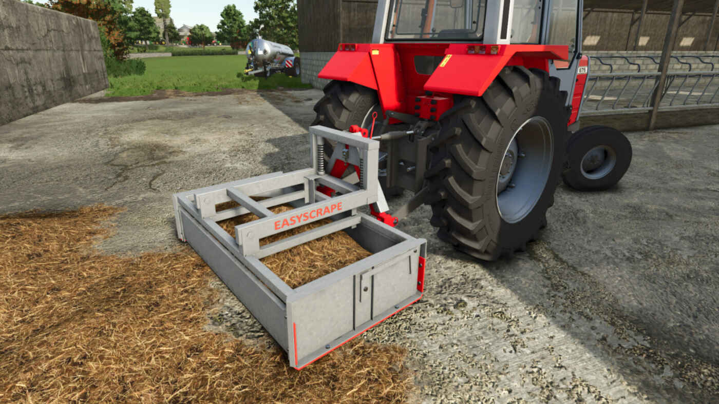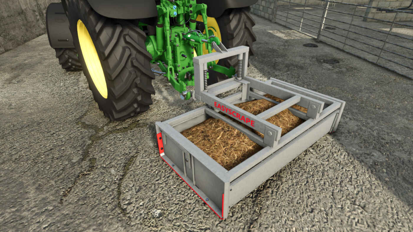 La conduite sur le contenu en vrac remplit le grattoir de la cour, soulevant l’implémentation vers le haut déverse le contenu.