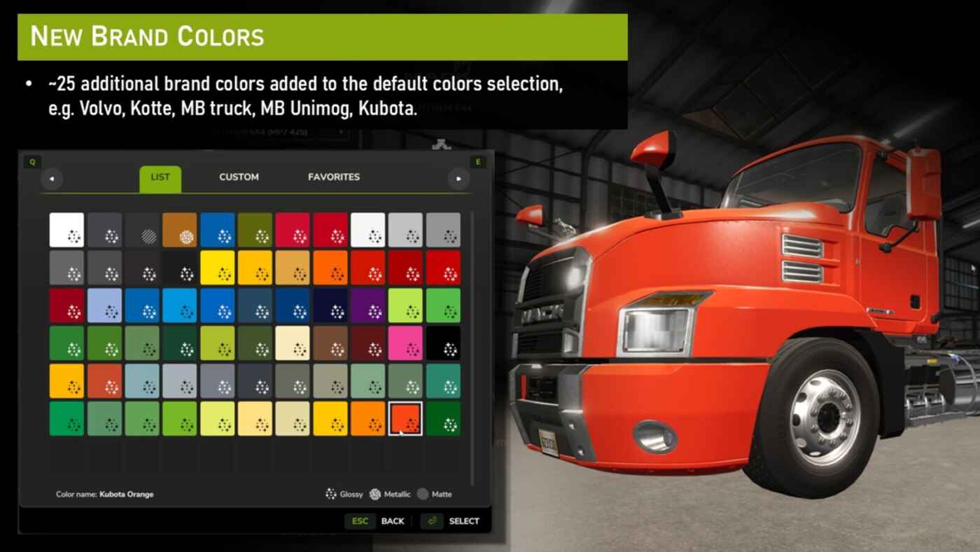 – Ajoute environ 25 couleurs manquantes à la sélection de couleurs par défaut (par exemple, jaune Volvo, orange Kubota, camion MB et couleurs Unimog, etc.).