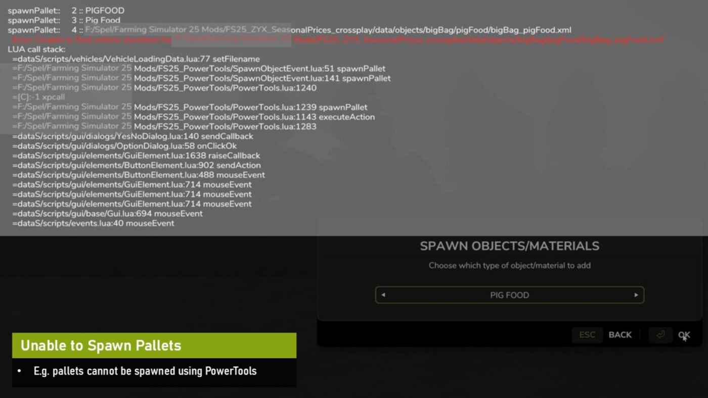 — « Impossible de trouver l’article de magasin de véhicule pour ‘C:/MODS/FS25_ZYX_SeasonalPrices_crossplay/data/objects/bigBag/pigFood/bigBag_pigFood.xml' »