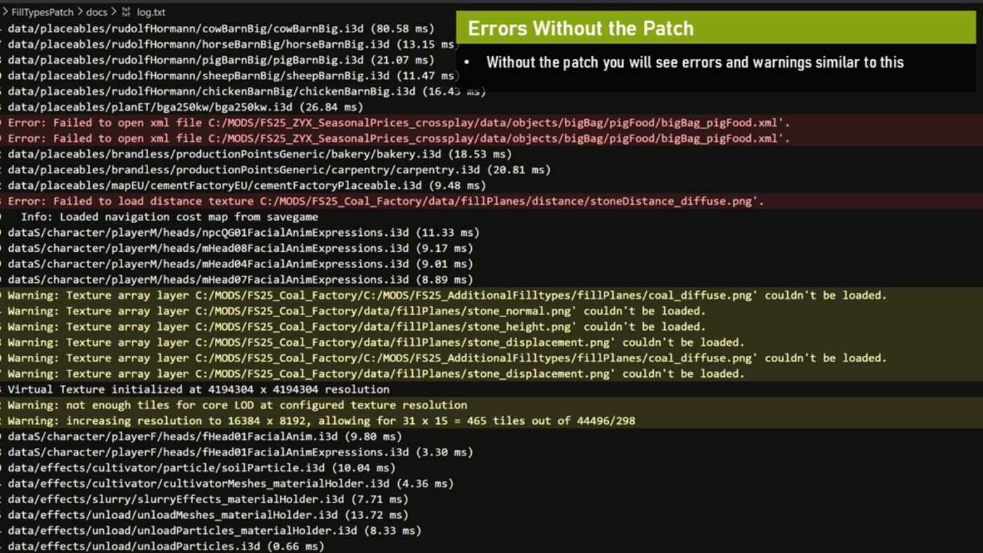 — « La couche de tableau de textures ‘C:/MODS/FS25_Coal_Factory/C:/MODS/FS25_AdditionalFilltypes/fillPlanes/coal_diffuse.png’ n’a pas pu être chargée. »
