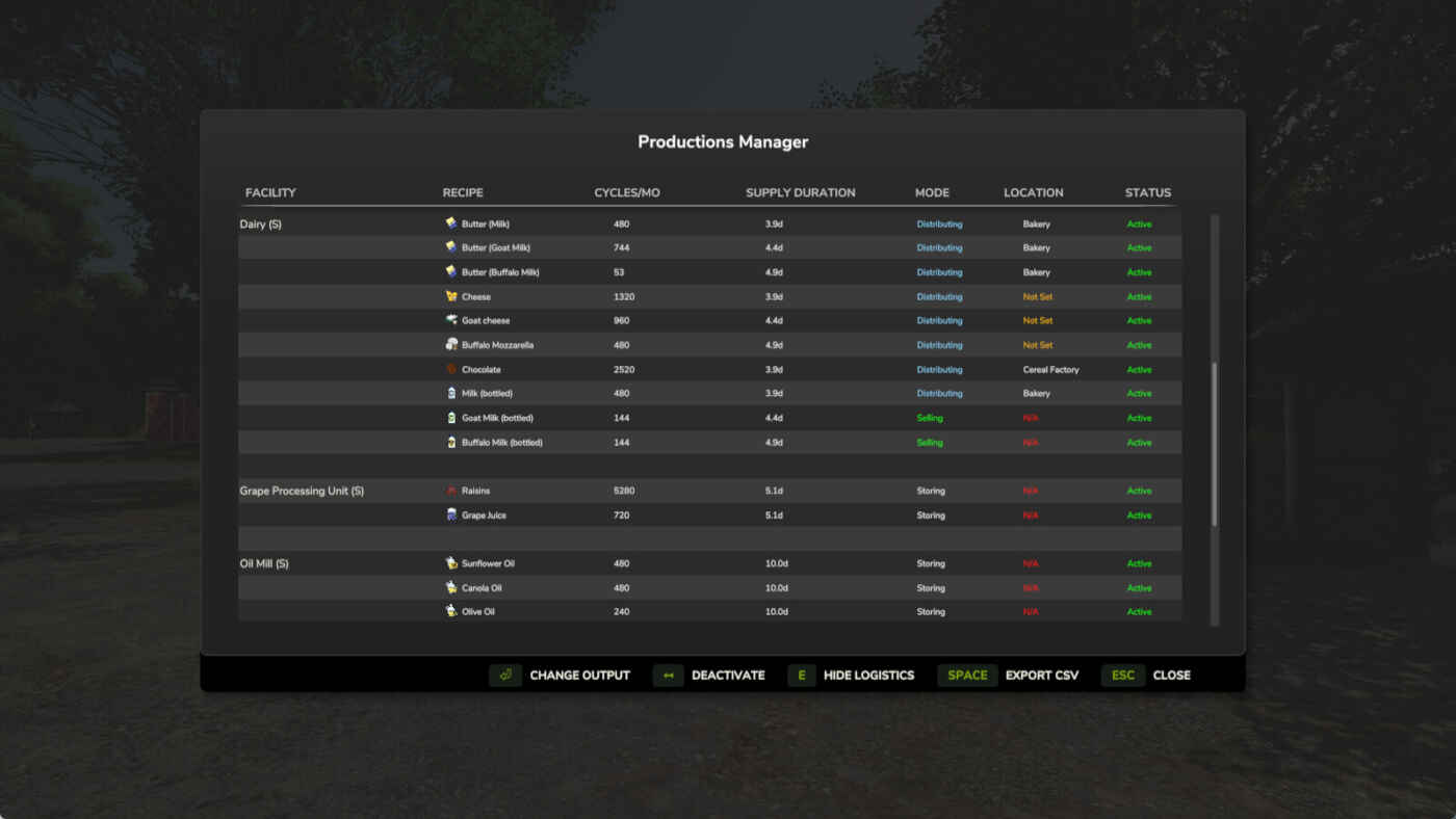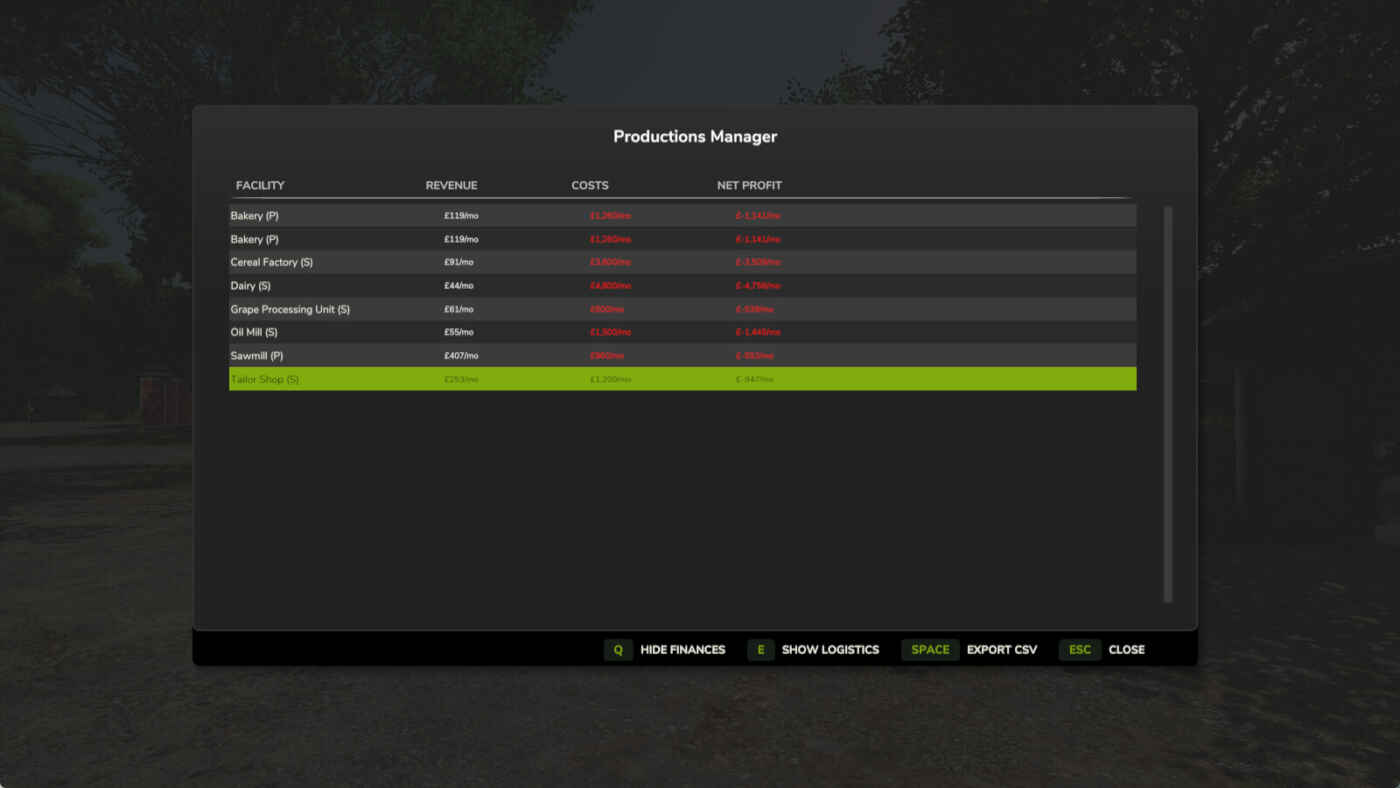 • Aperçu de la production : affichez toutes les productions avec les niveaux de remplissage, les capacités et les revenus mensuels.