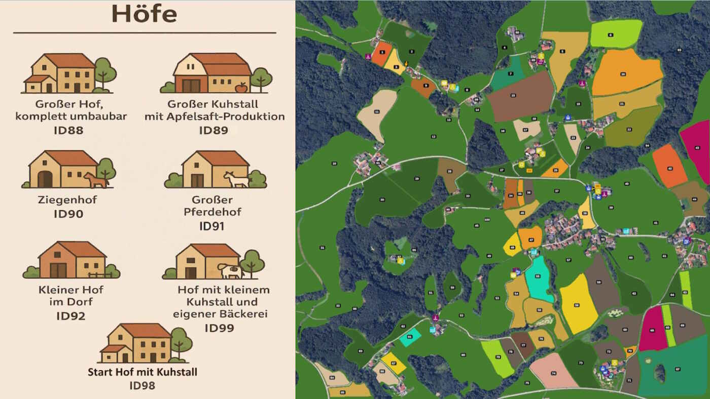 Une ferme spécialisée dotée d’une étable à vaches moderne de grande capacité combinée à une ligne de production de jus de pomme intégrée. Parfait pour les joueurs souhaitant mélanger l’élevage laitier avec une industrie unique de transformation des fruits.