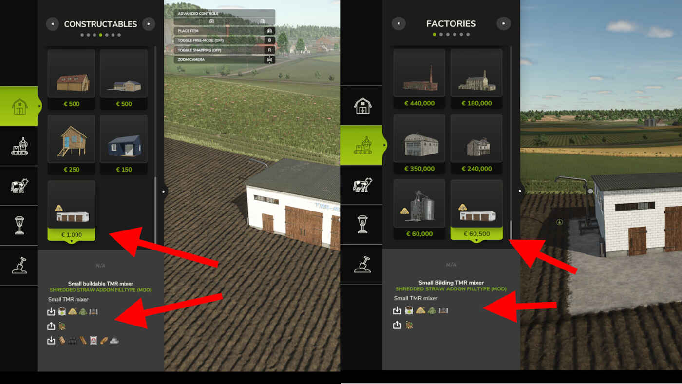 La paille déchiquetée peut être utilisée pour le TMR uniquement via le mélangeur TMR plaçable inclus ; le chariot mélangeur d’aliments du jeu fonctionne uniquement avec de la paille ordinaire.