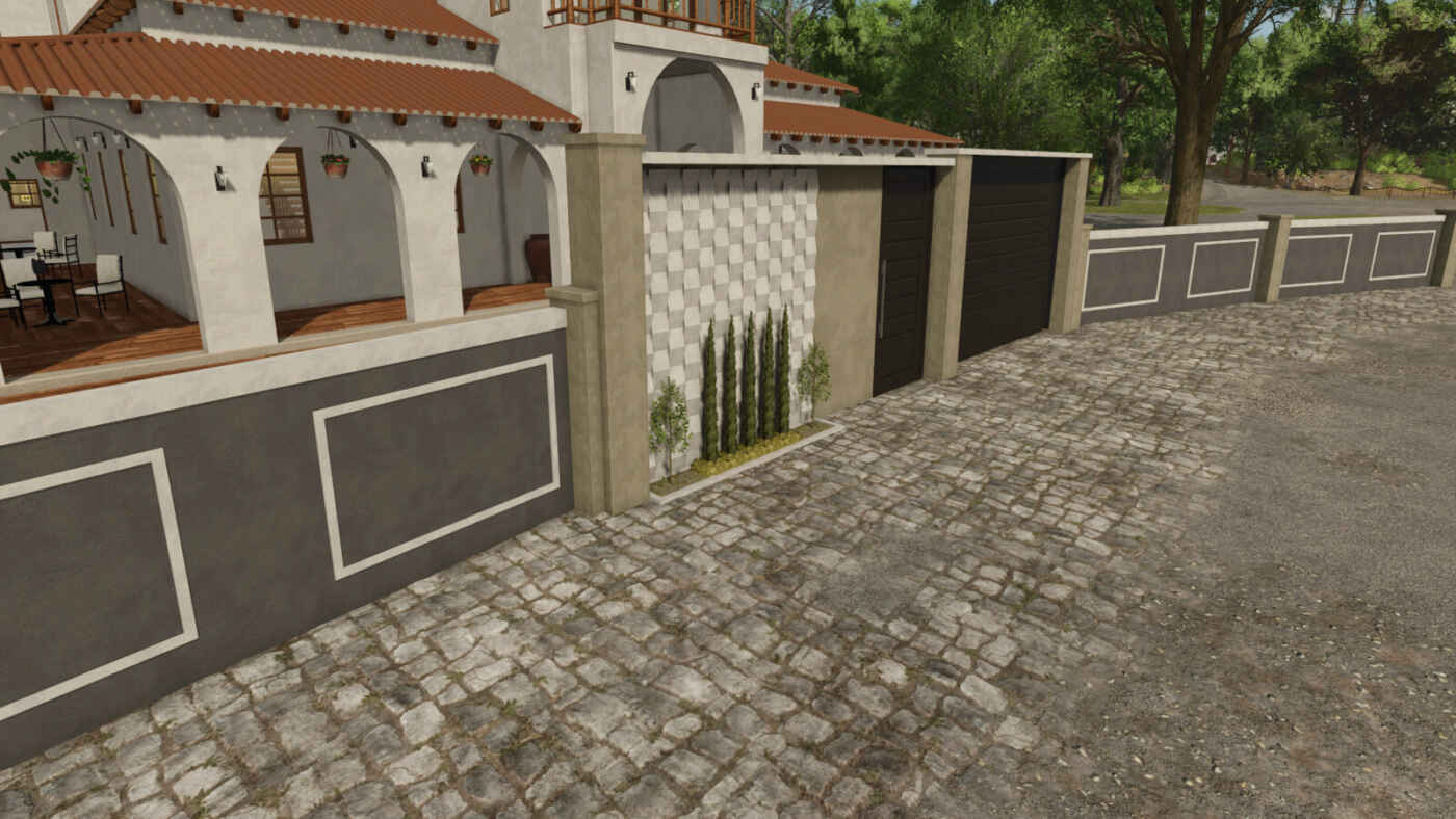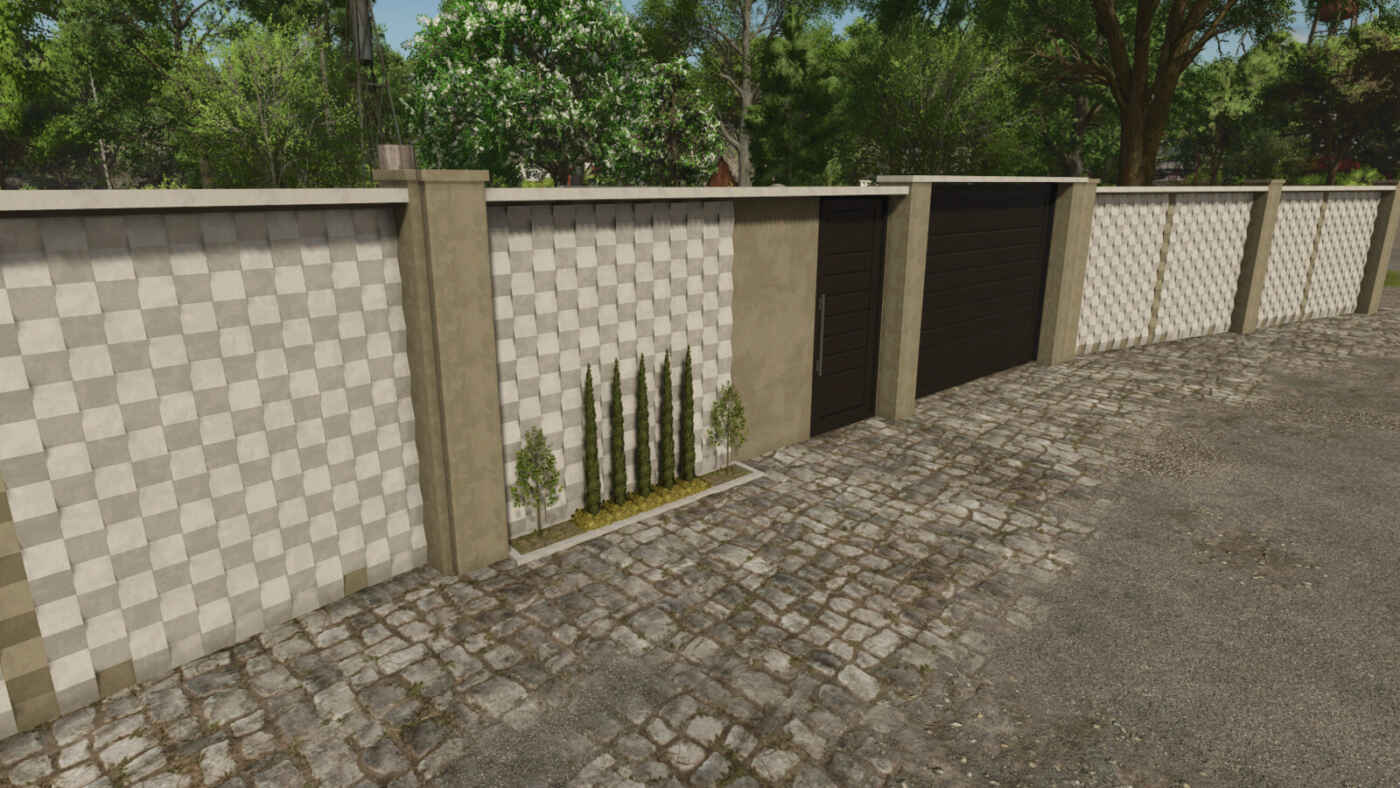 Nous proposons trois options de clôture : une clôture murale avec portail et porte de garage, et une simple porte de garage.
